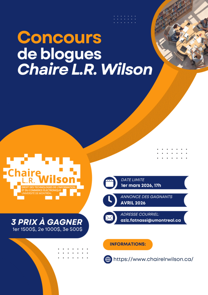 Scribo, Ergo Sum : concours de blogue La Chaire L.R. Wilson sur le droit des technologies de l’information et du commerce électronique, du Centre de recherche en droit public de la Faculté de droit de l’Université de Montréal, consacre ses activités à l’étude des mutations du droit et des autres normativités encadrant les échanges dans […] Lire la suite