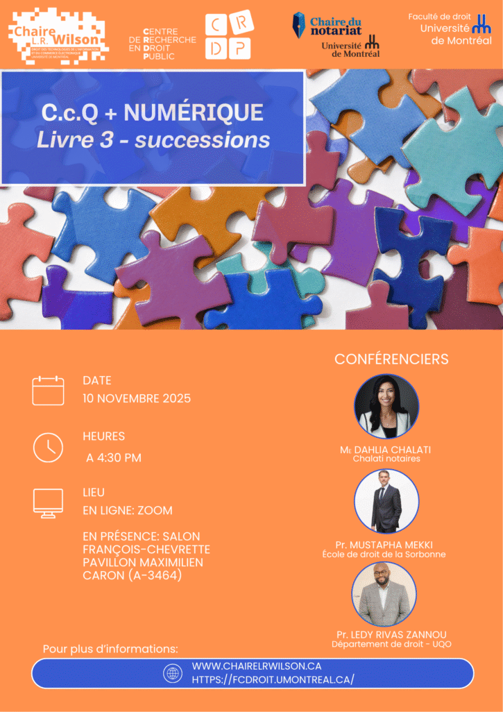 🎓 Conférence à venir – lundi 10 novembre 2025 ! Cette activité vise à observer les interactions entre les différents livres du Code civil du Québec et les nouvelles technologies du numérique. La présente s’intéresse particulièrement au Livre 3 des successions. Venez écouter maitre Dahlia Chalati (Chalati Notaire • Notary), ainsi que les professeurs Mustapha Mekki et Ledy […] Lire la suite