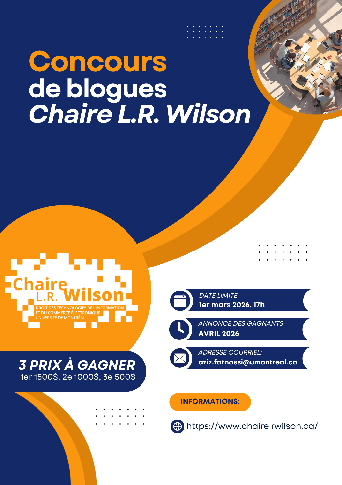 La Chaire L.R. Wilson sur le droit des technologies de l’information et du commerce électronique, du Centre de recherche en droit public de la Faculté de droit de l’Université de Montréal, consacre ses activités à l’étude des mutations du droit et des autres normativités encadrant les échanges dans le cyberespace. C’est pourquoi, la Chaire L.R. Wilson ouvre un concours de billets de blogue visant à initier les étudiants à la recherche et à encourager la diffusion d’idées nouvelles au sein de la communauté scientifique. Cette initiative s’adresse aux étudiants inscrits dans un programme de maîtrise ou de doctorat à l’Université de Montréal. Au terme du processus d’évaluation, les quatre meilleures contributions seront sélectionnées pour publication sur le blogue de la Chaire L.R. Wilson Des prix seront décernés aux auteurs des trois meilleures contributions, en reconnaissance de la qualité de leurs réflexions. Ce concours se veut un espace d’échanges, voué à l’étude d’un droit traversé par de profondes métamorphoses, dans l’ambition de le repenser au gré de ses évolutions. La Chaire L.R. Wilson réaffirme ainsi sa volonté de soutenir la maturité intellectuelle de la relève en recherche et de participer activement à l’enrichissement de la pensée juridique québécoise.