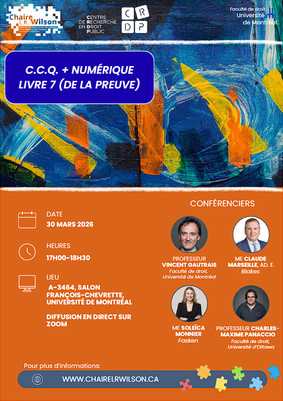 🎓 Conférence à venir – lundi 30 mars 2026 ! Cette conférence explore les mutations du Livre 7 (Preuve) du Code civil du Québec et de la Loi concernant le cadre juridique des technologies de l’information face aux défis technologiques. À travers quatre panels interactifs, nos experts analyseront les concepts clés de l’authenticité, du transfert de […] Lire la suite