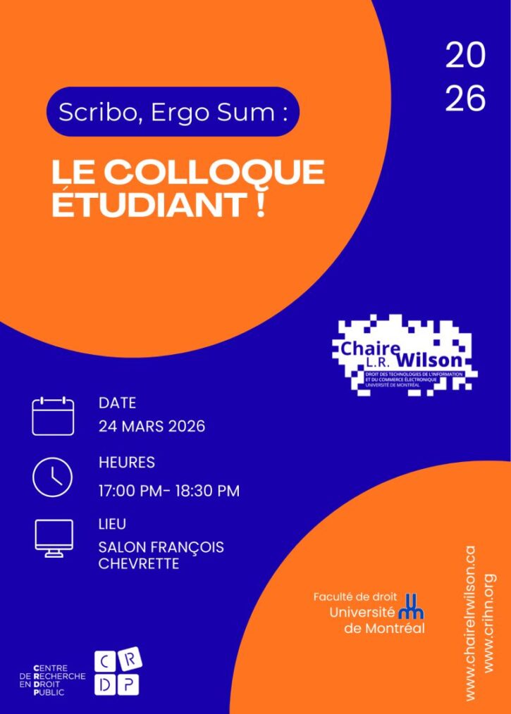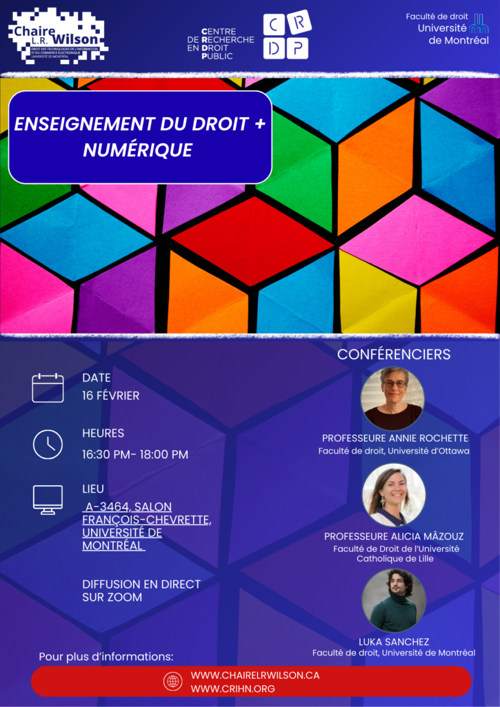 🎓 L’intelligence artificielle transforme la pratique du droit, mais qu’en est-il de son enseignement ? La Chaire L.R. Wilson a le plaisir d’organiser un séminaire portant sur les impacts, les enjeux et les questions autour de l’IA dans l’enseignement du droit. Ce séminaire sera animé par l’excellent Cristiano Therrien. 📌 Faculté de droit, salle […] Lire la suite